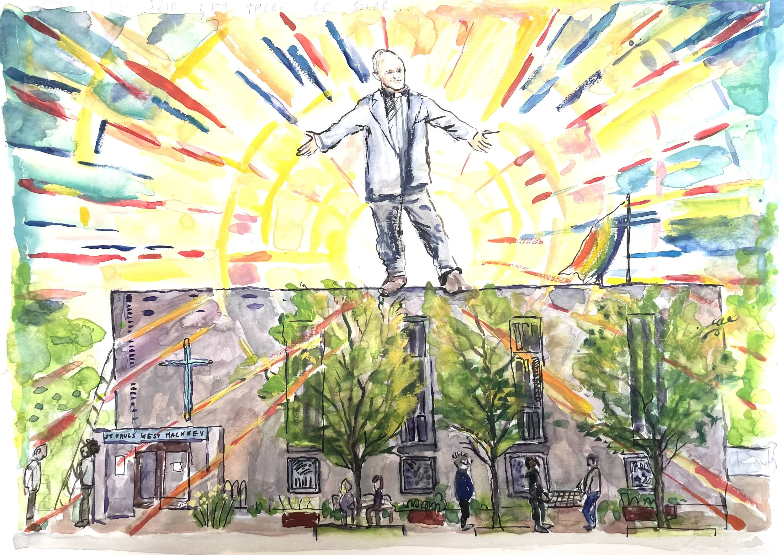 Painting presented to Neil Weir the Vicar of st Pauls West Hackney on completion of the installs of the solar panels and air source heat pumps.